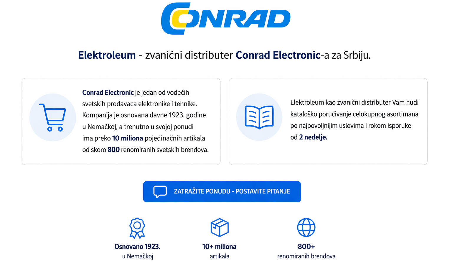 O NAMA: Elektroleum se bavi uvozom, distribucijom i prodajom elektronskih komponenti, alata, lemne, merne, mrežne i test opreme, razvojnih sistema, hemijskih i ostalih proizvoda namenjenih sličnoj svrsi...