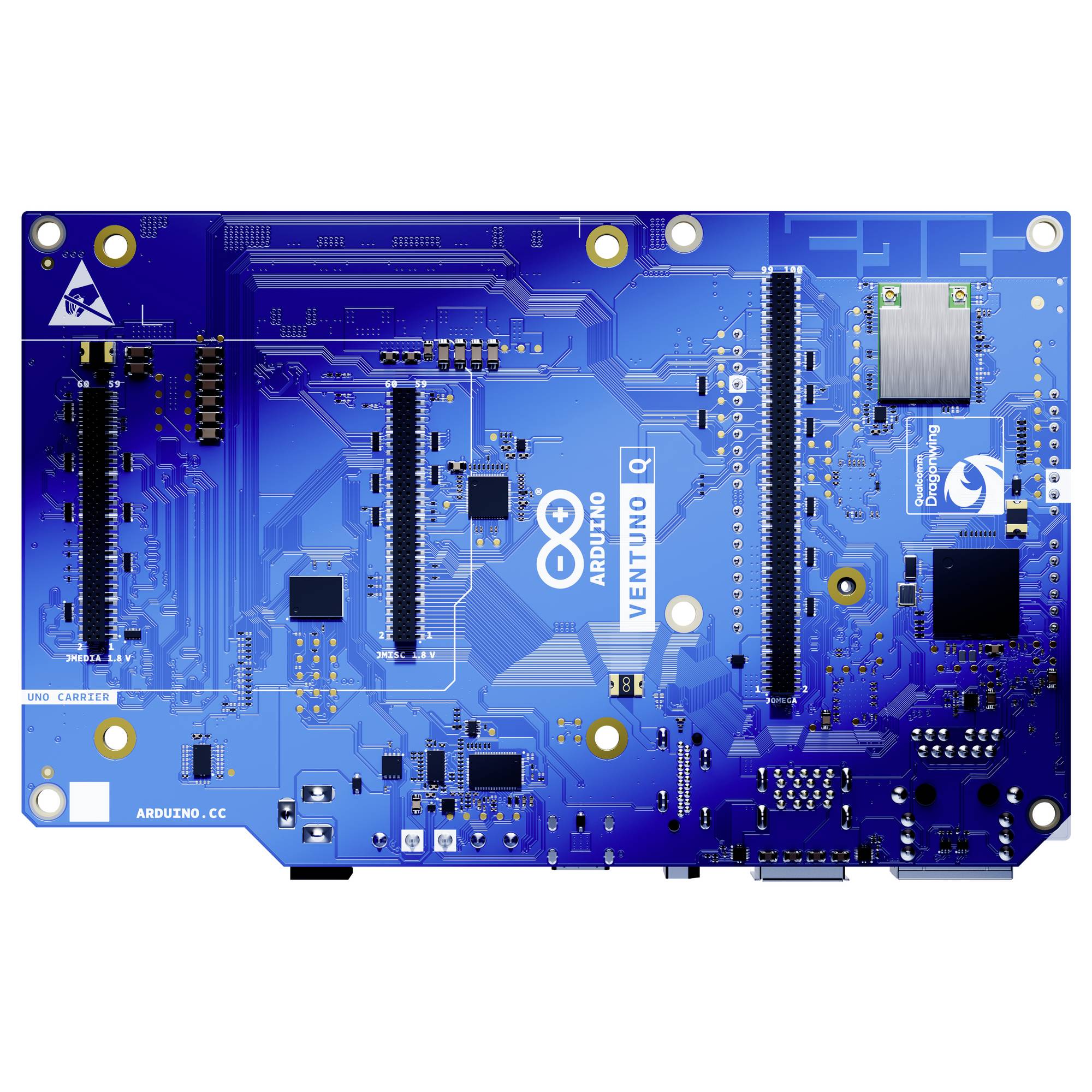 Arduino VENTUNO Q je moćna SBC platforma namenjena zahtevnim projektima koji objedinjuju edge computing i real-time kontrolu. Ovaj model koristi dual processor sistem zasnovan na Qualcomm® Dragonwing™ platformi za visok nivo obrade i STM32H5 mikrokontroleru za real-time upravljanje, čime omogućava istovremeno izvođenje složenih AI zadataka i preciznu kontrolu hardvera.