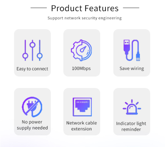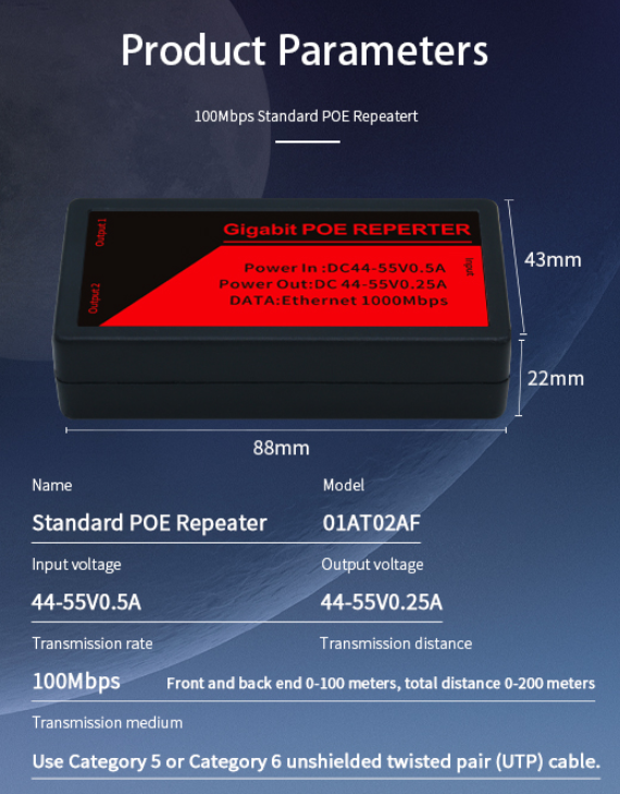 Uređaj prima PoE ulaz (802.3at do 30W) i deli ga na dva izolovana PoE izlaza (802.3af do 15.4W po portu), uz podršku za Fast Ethernet (10/100 Mb/s). Ovo omogućava efikasno i sigurno napajanje više uređaja kao što su IP kamere i access point-i.