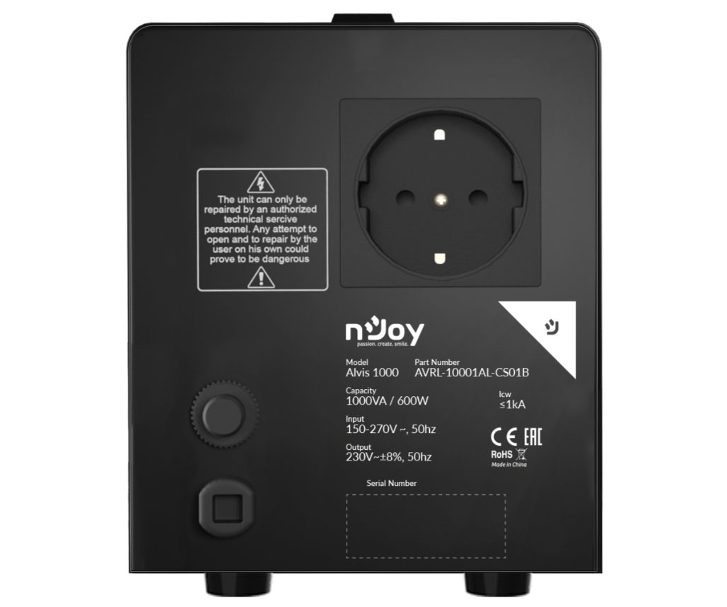 nJoy Alvis 1000 je kompaktan automatski stabilizator napona (AVR) namenjen zaštiti električnih uređaja od nestabilnog napona u električnoj mreži. Sa kapacitetom od 1000VA / 600W, uređaj efikasno stabilizuje ulazni napon i štiti priključenu opremu od prenapona, podnapona i prenaponskih udara.