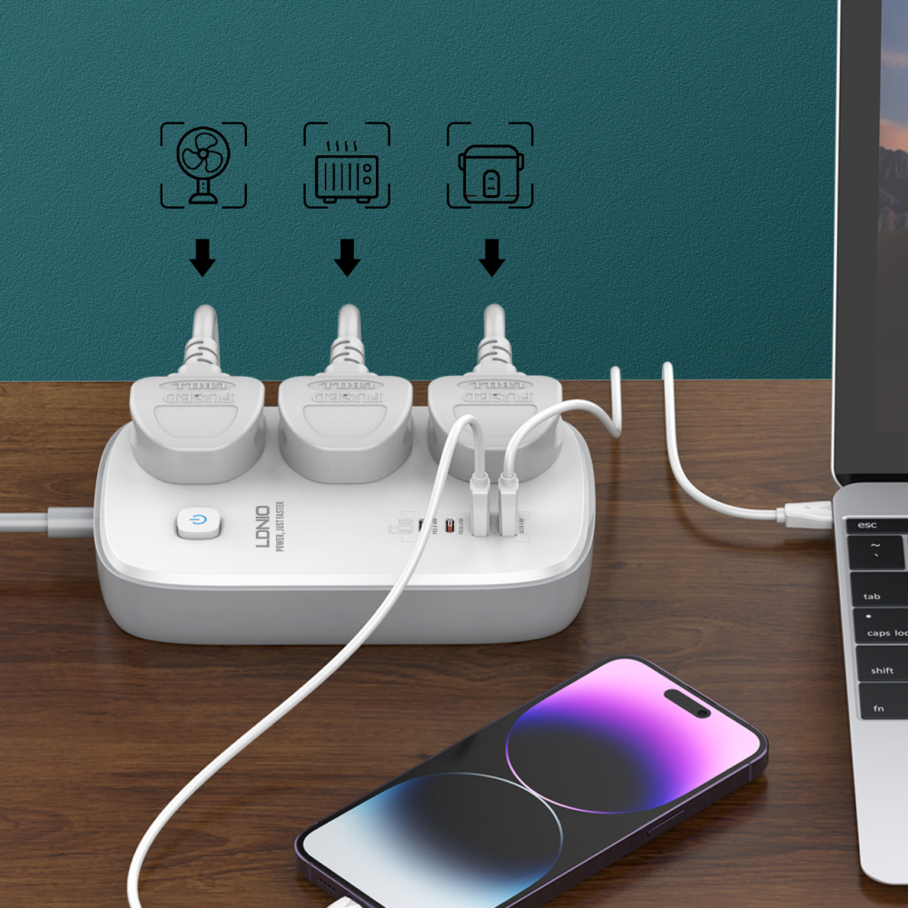 LDNIO SC3416 EU je višenamenski produžni kabl sa integrisanim GaN punjačem, dizajniran za savremene domove, kancelarije i radne prostore. Kombinuje 3 EU utičnice sa 2x USB-A QC portovima i 2x USB-C PD portovima, omogućavajući napajanje i brzo punjenje više uređaja istovremeno.