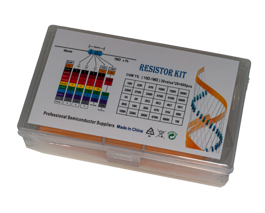 Ovaj komplet preciznih otpornika je savršen za sve vrste elektronskih projekata, servisa i prototipova. Sadrži 30 različitih vrednosti otpornika, po 20 komada svake, ukupno 600 otpornika snage 1/4 W sa tolerancijom od 1%. Izrađeni su u metalfilm tehnologiji, što im omogućava nisku toleranciju, stabilnost i dug vek trajanja. Organizovani su u prozirnoj plastičnoj kutiji sa pregradama i označenim vrednostima, što olakšava brzo pronalaženje potrebne komponente.