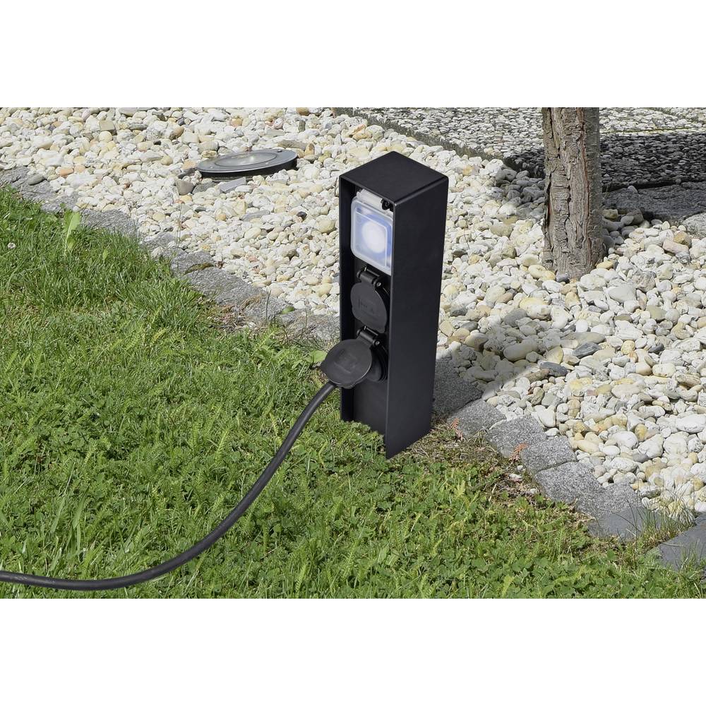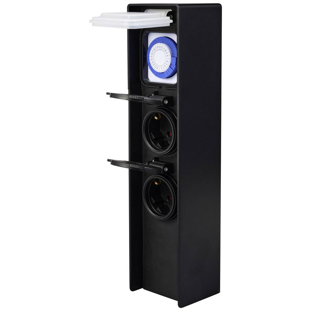 Sygonix SY-6121656 je robustan vodootporni stub za baštenske utičnice sa integrisanim mehaničkim 24-časovnim tajmerom. Poseduje dve zaštitne Schuko utičnice sa zaštitnim poklopcem, aluminijumsko crno kućište, uzemljenje preko zemlje pomoću klina i IP44 sertifikat za zaštitu od prskanja vode i prašine. :contentReference[oaicite:0]{index=0}