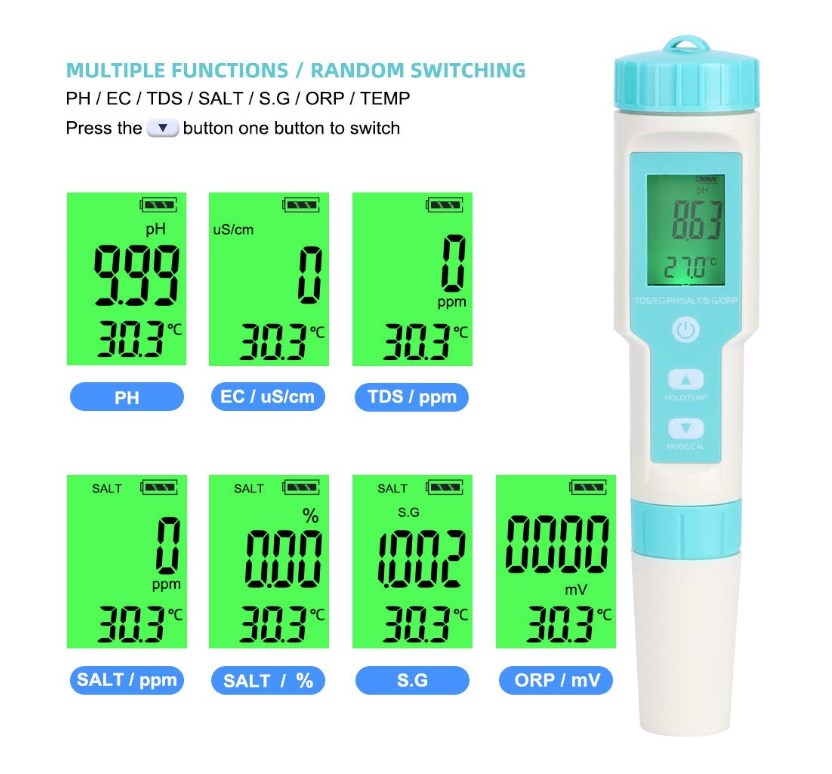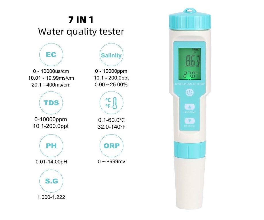 Ovaj multifunkcionalni digitalni tester omogućava precizno merenje sedam ključnih parametara kvaliteta vode: pH vrednosti, ukupno rastvorenih čvrstih materija (TDS), električne provodljivosti (EC), oksido-redukcionog potencijala (ORP), saliniteta (Salt), specifične težine (S.G) i temperature. Kompaktan i vodootporan dizajn (IP67) čini ga idealnim za upotrebu u akvaristici, hidroponici, bazenima, laboratorijama i industriji hrane i pića.