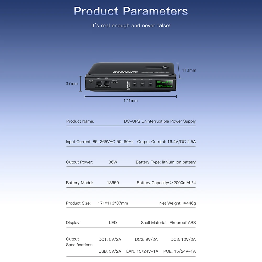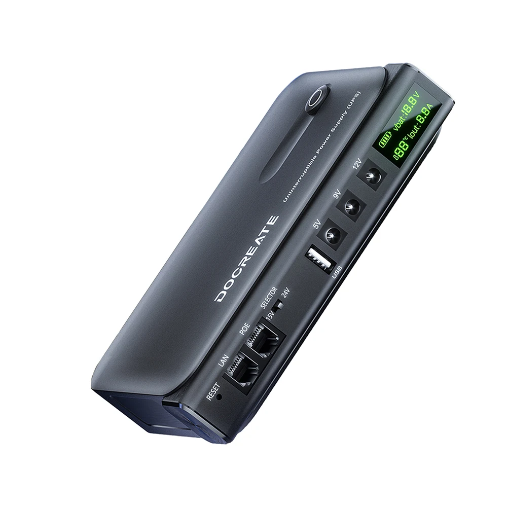 Ugrađeni sistem koristi 4x 18650 Li-ion baterije sa dugim radnim vekom (≥500 ciklusa), a podržava više izlaznih napona: 5V, 9V i 12V, uključujući LAN i POE opcije. Verzija sa EU utikačem omogućava direktno povezivanje na standardnu evropsku mrežu (AC 85–265V).